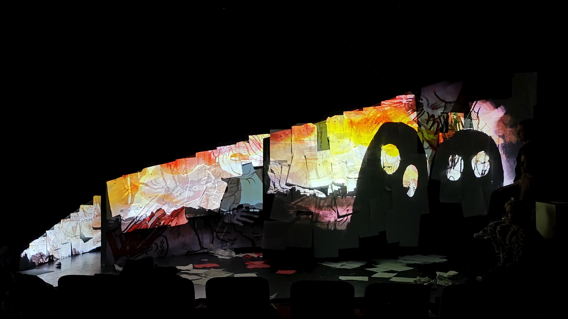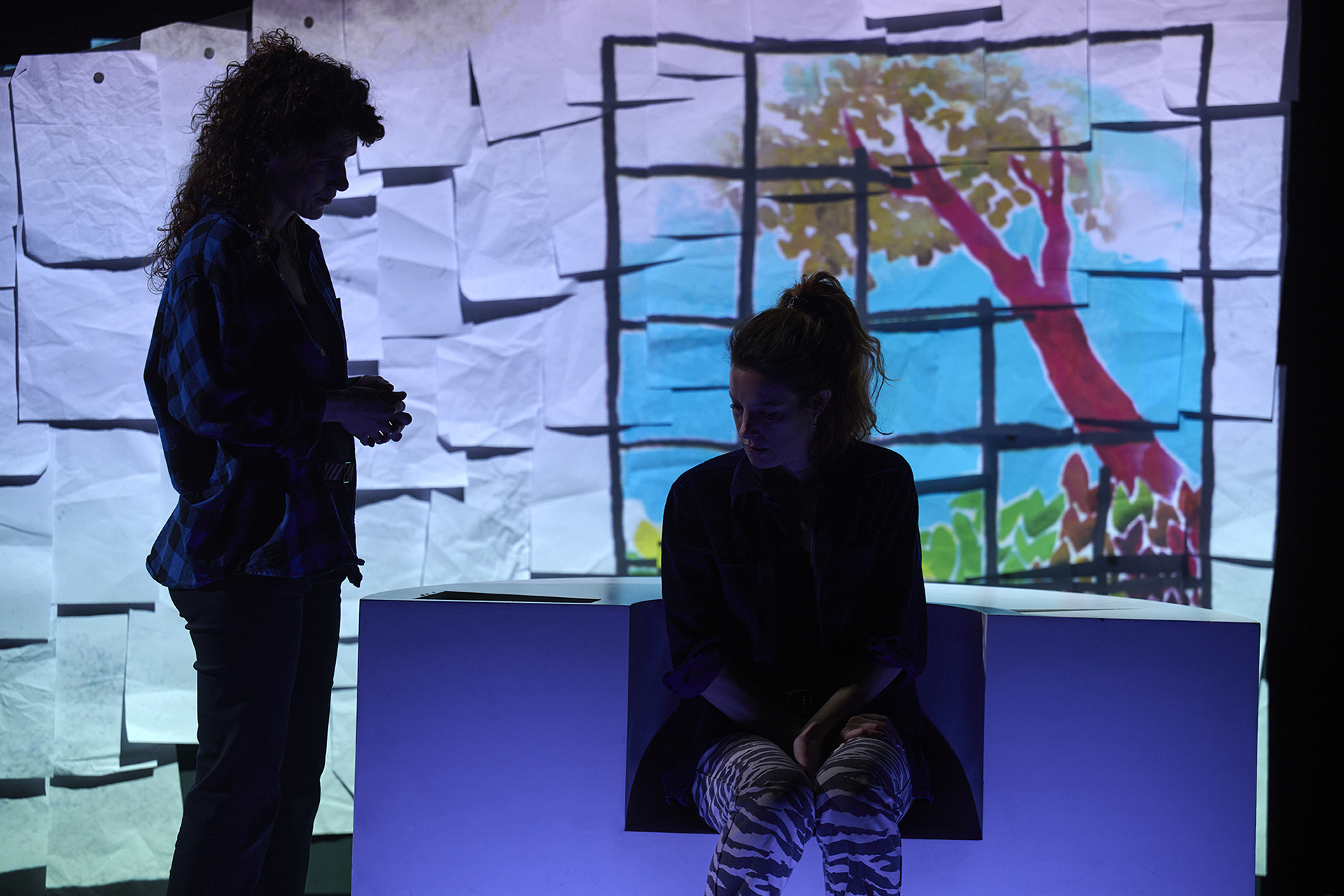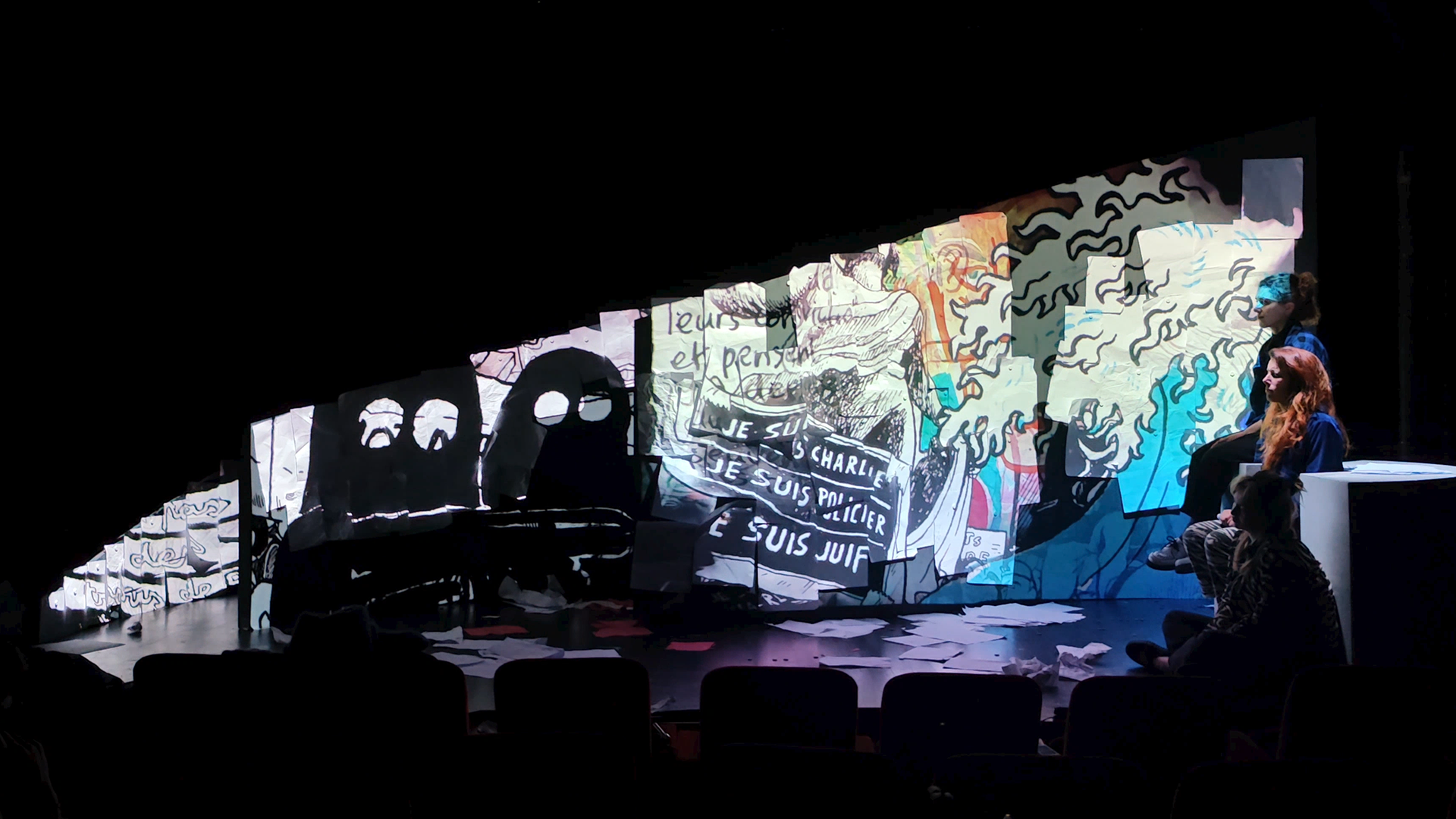 Avec une amie designer et le metteur en scène, nous nous sommes inspirés et avons sélectionnés des dessins de la BD, ils ont ensuite été projetés sur une scénographie. Il y avait un vrai travail de composition et d'animation. Et tout ça devait être en parfaite synchronisation avec le jeu des comédiennes.